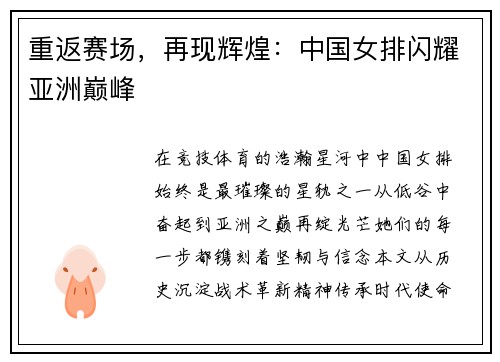 在竞技体育的浩瀚星河中,中国女排始终是最璀璨的星轨之一。从低谷中奋起,到亚洲之巅再绽光芒,她们的每一步都镌刻着坚韧与信念。本文从历史沉淀、战术革新、精神传承、时代使命四个维度,解析中国女排如何以实...